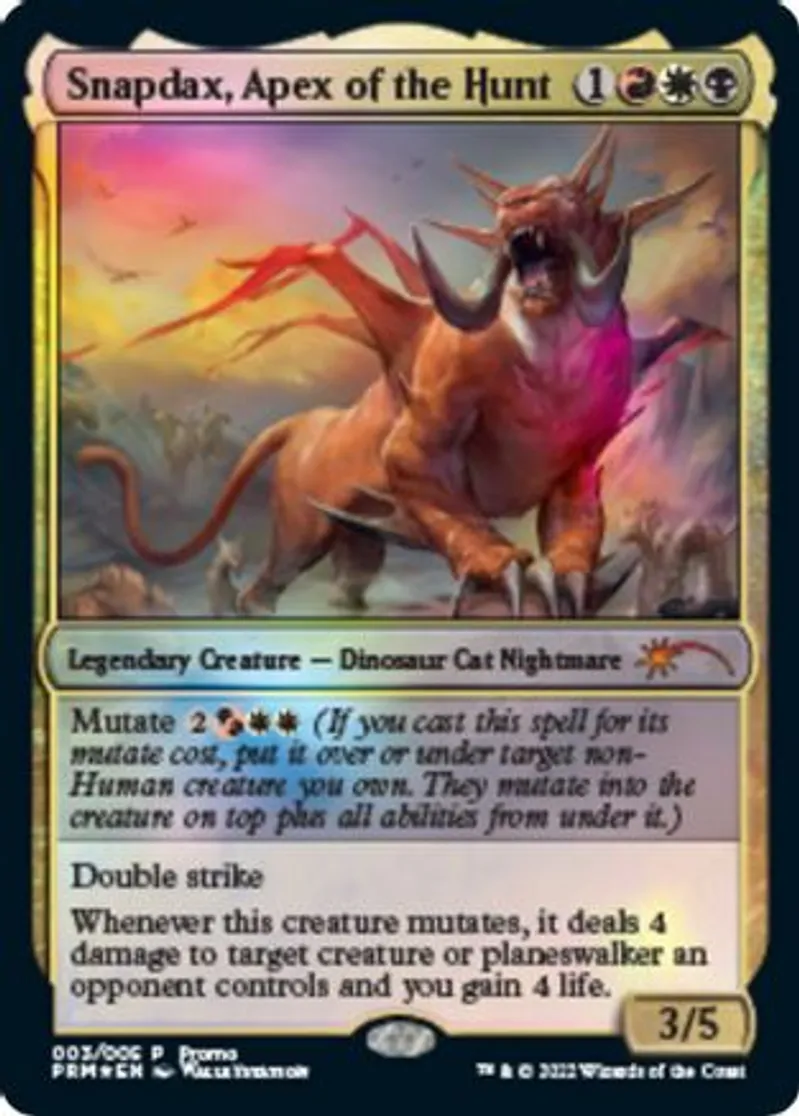 Magic: the Gathering (mtg) Special Legendary Creature — Dinosaur Cat Nightmare Snapdax, Apex of the Hunt from Unique and Miscellaneous Promos (pUNI) last updated 2026-02-25 15:42:06
