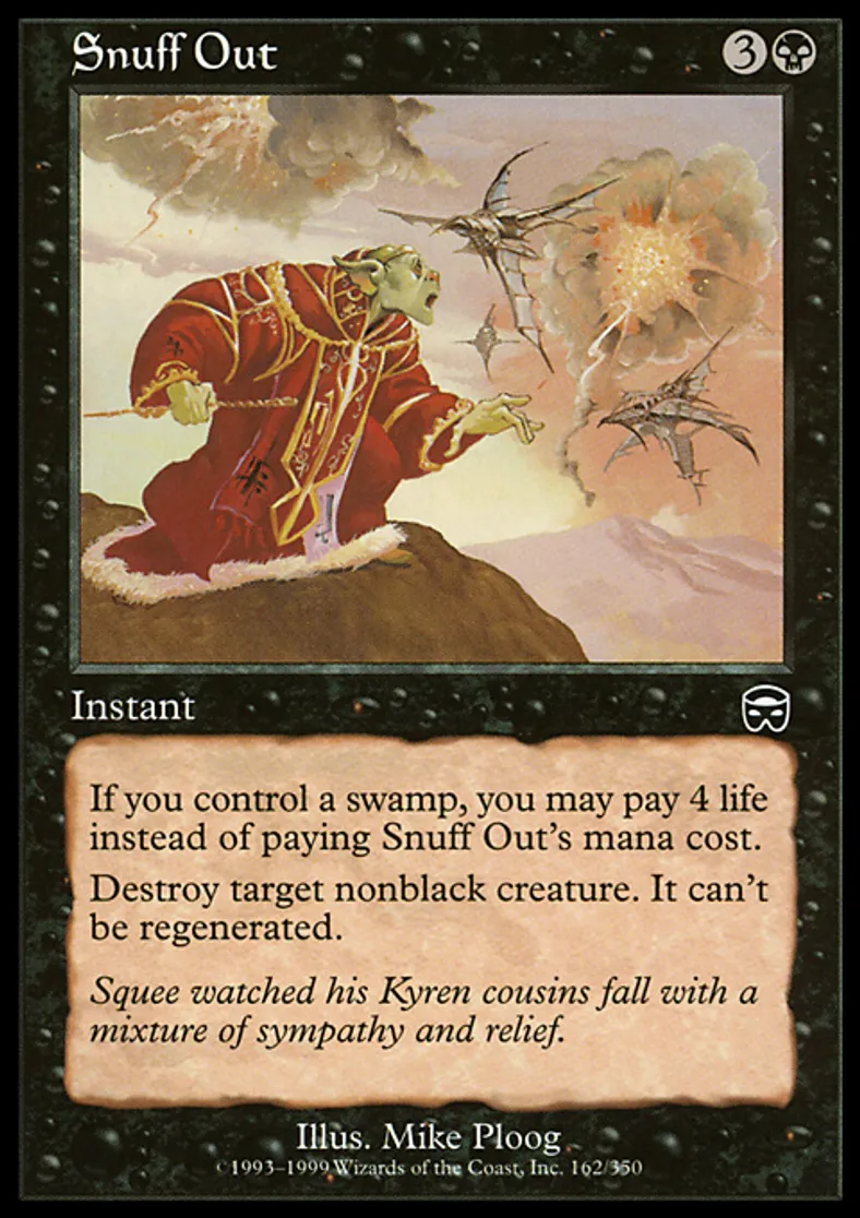 | Oracle Text | If you control a Swamp, you may pay 4 life rather than pay Snuff Out's mana cost. Destroy target nonblack creature. It can't be regenerated. | ||