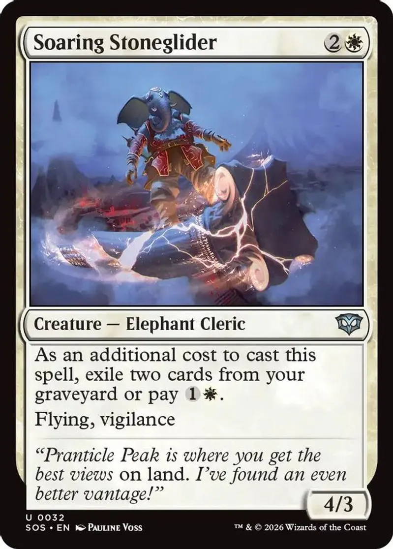 Magic: the Gathering (mtg) Uncommon creature — elephant cleric Soaring Stoneglider from Secrets of Strixhaven (SOS) last updated 2026-04-16 23:16:07