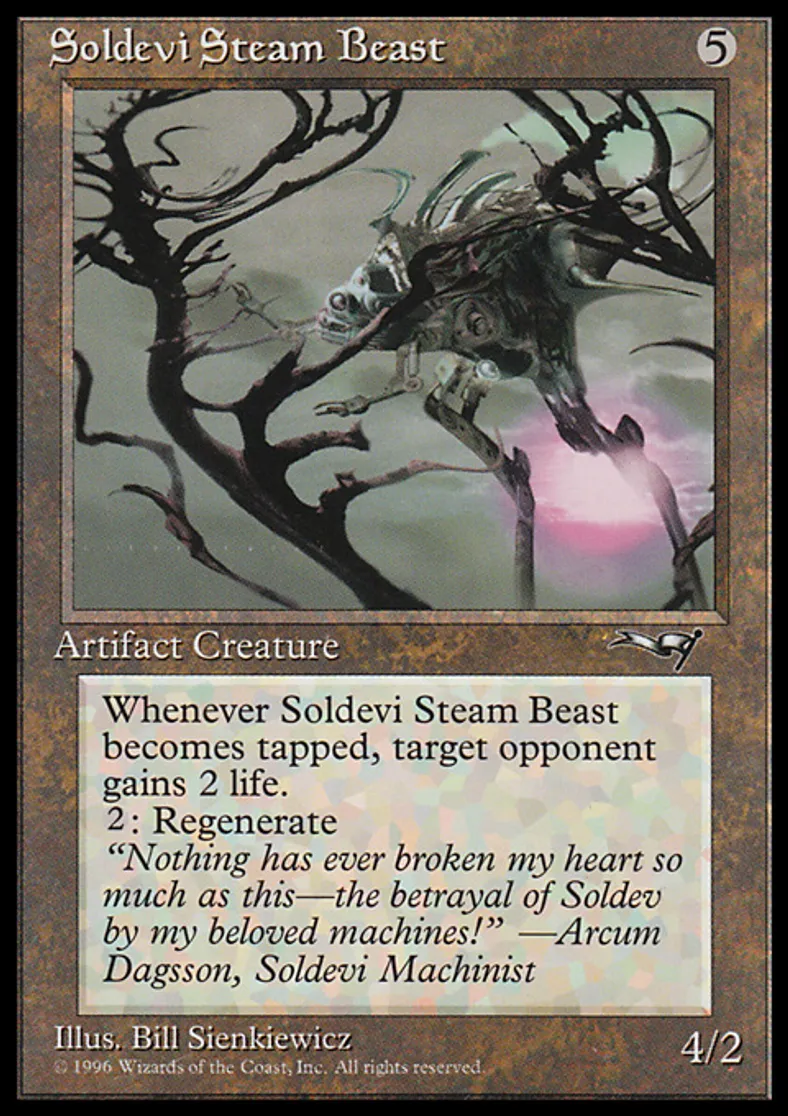 | Oracle Text | Whenever Soldevi Steam Beast becomes tapped, target opponent gains 2 life. {{2}}: Regenerate Soldevi Steam Beast. | ||