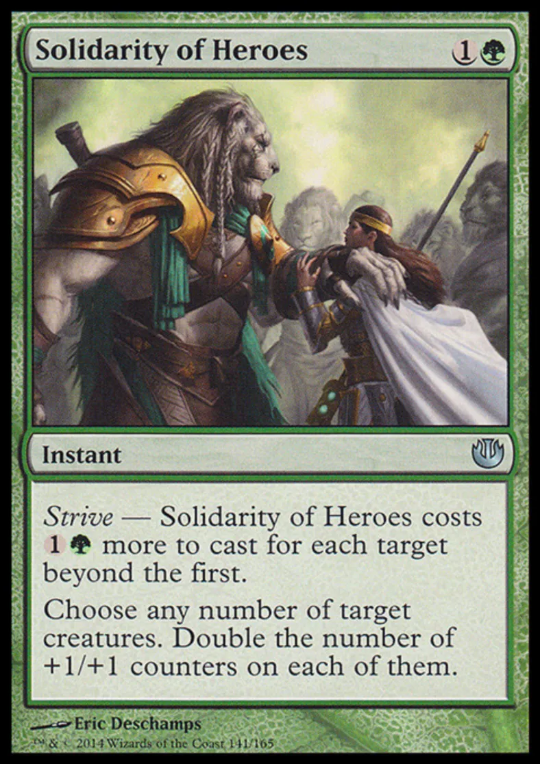 | Oracle Text | Strive — Solidarity of Heroes costs {{1}}{{g}} more to cast for each target beyond the first. Choose any number of target creatures. Double the number of +1/+1 counters on each of them. | ||