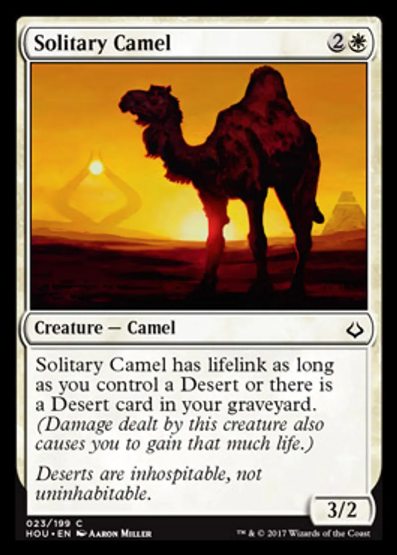 | Oracle Text | Solitary Camel has lifelink as long as you control a Desert or there is a Desert card in your graveyard. (Damage dealt by this creature also causes you to gain that much life.) | ||
