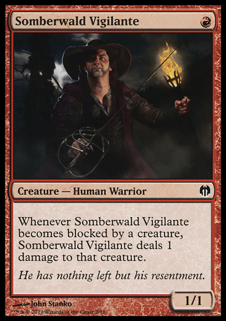| Oracle Text | Whenever Somberwald Vigilante becomes blocked by a creature, Somberwald Vigilante deals 1 damage to that creature. | ||