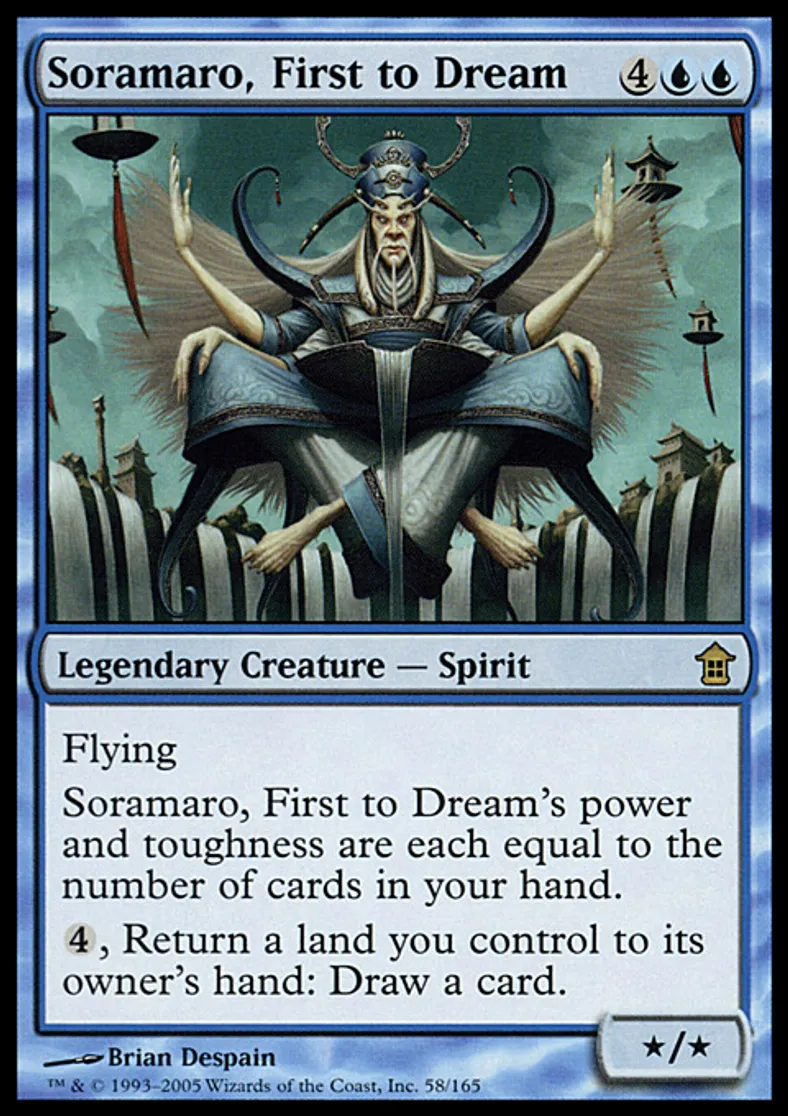 | Oracle Text | Flying Soramaro, First to Dream's power and toughness are each equal to the number of cards in your hand. {{4}}, Return a land you control to its owner's hand: Draw a card. | ||