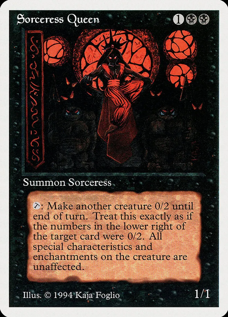 | Oracle Text | {T}: Target creature other than Sorceress Queen has base power and toughness 0/2 until end of turn. | ||