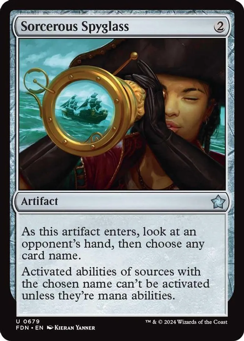 Magic: the Gathering (mtg) Uncommon artifact Sorcerous Spyglass from Foundations (FDN) last updated 2025-12-13 15:30:32