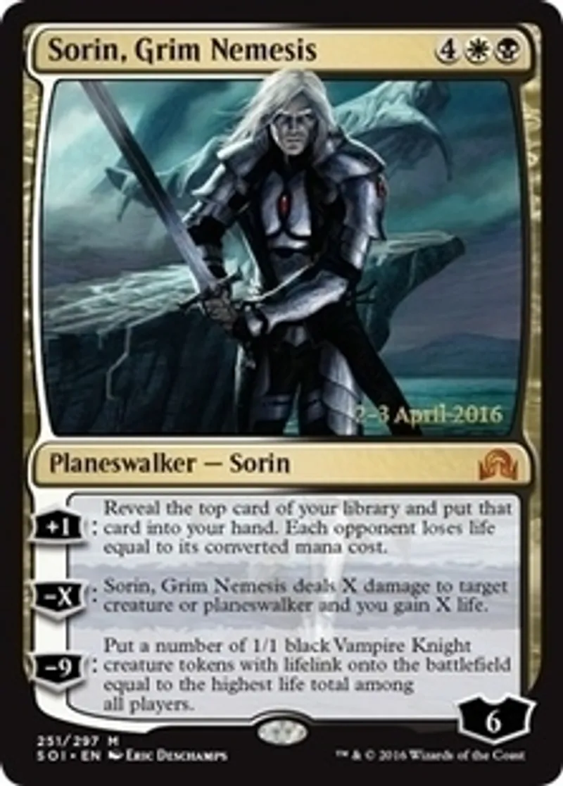 | Oracle Text | +1: Reveal the top card of your library and put that card into your hand. Each opponent loses life equal to its converted mana cost.\r\n-X: Sorin, Grim Nemesis deals X damage to target creature or planeswalker and you gain X life.\r\n-9: Put a number of 1/1 black Vampire Knight creature tokens with lifelink onto the battlefield equal to the highest life total among all players. | ||