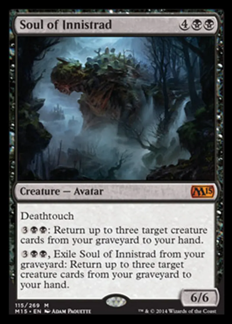 | Oracle Text | Deathtouch {{3}}{{b}}{{b}}: Return up to three target creature cards from your graveyard to your hand. {{3}}{{b}}{{b}}, Exile Soul of Innistrad from your graveyard: Return up to three target creature cards from your graveyard to your hand. | ||