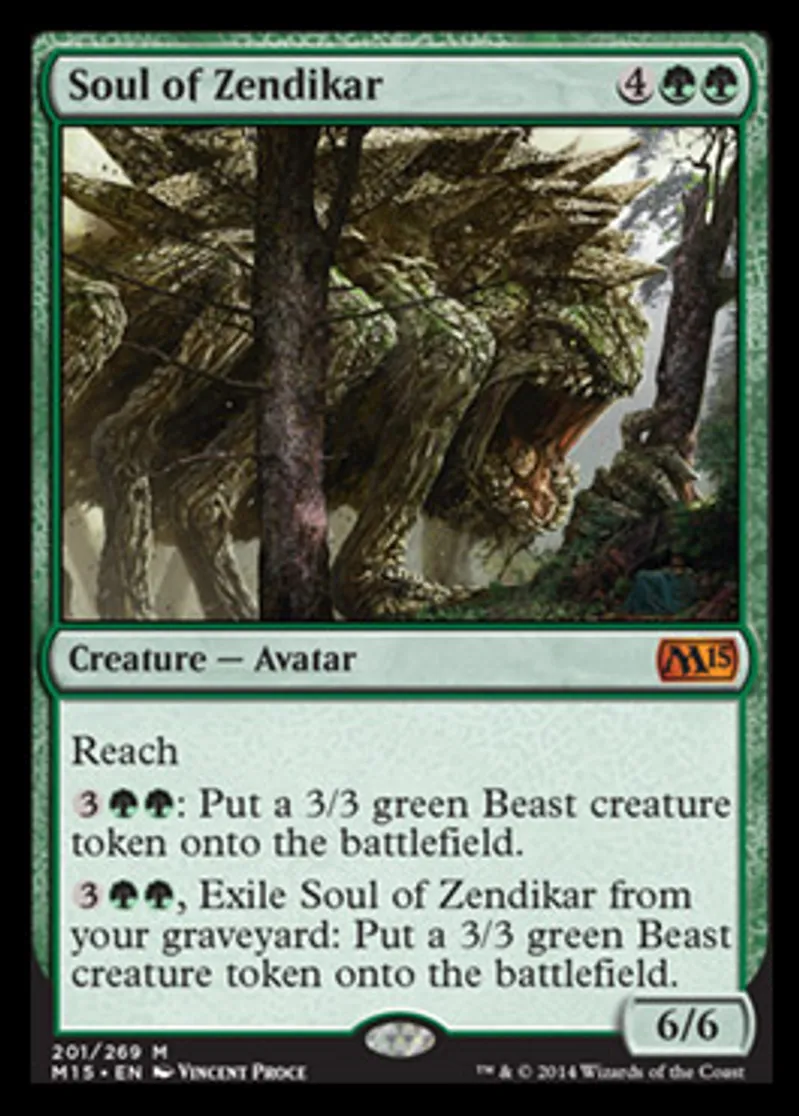 | Oracle Text | Reach {{3}}{{g}}{{g}}: Put a 3/3 green Beast creature token onto the battlefield. {{3}}{{g}}{{g}}, Exile Soul of Zendikar from your graveyard: Put a 3/3 green Beast creature token onto the battlefield. | ||