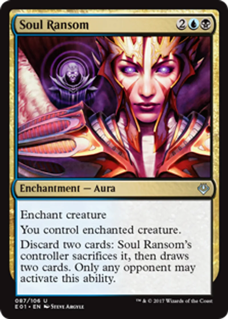 | Oracle Text | Enchant creature You control enchanted creature. Discard two cards: Soul Ransom's controller sacrifices it, then draws two cards. Only any opponent may activate this ability. | ||