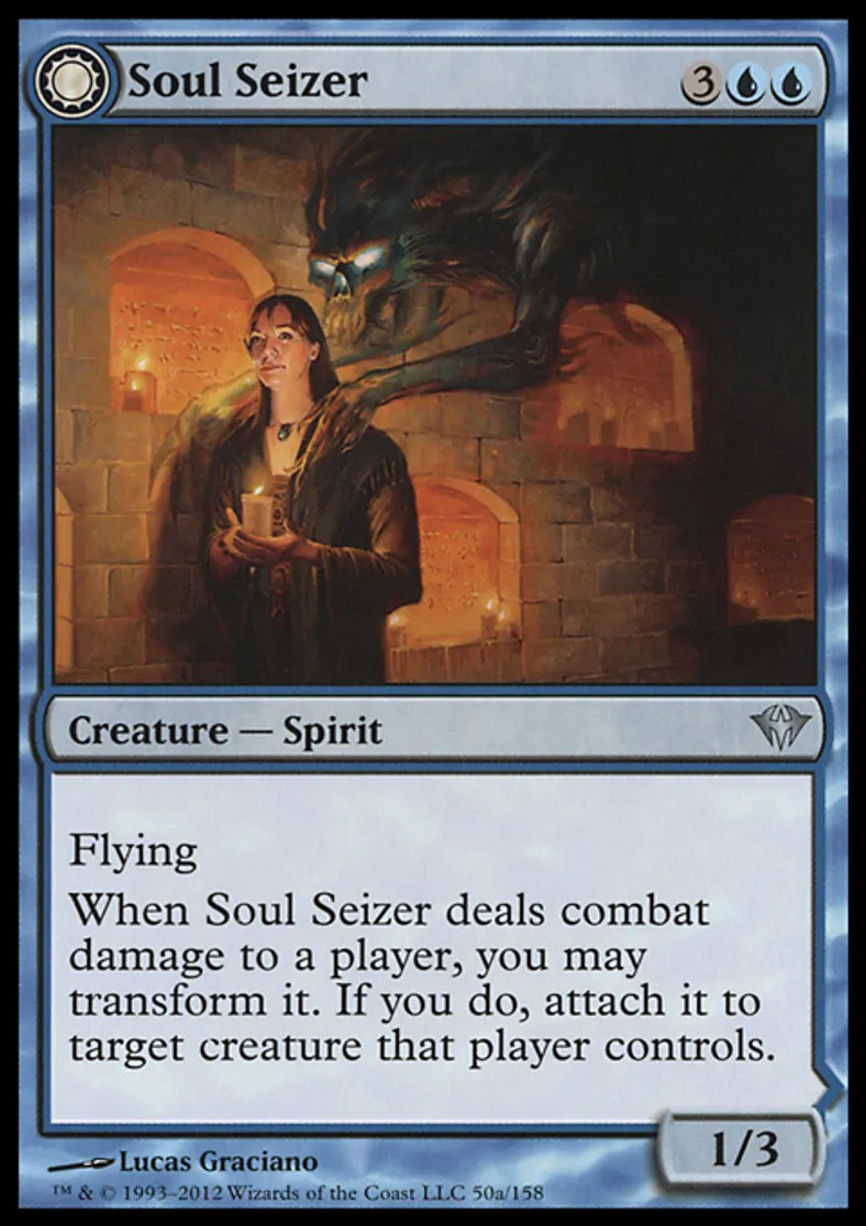 | Oracle Text | Flying When Soul Seizer deals combat damage to a player, you may transform it. If you do, attach it to target creature that player controls. | ||