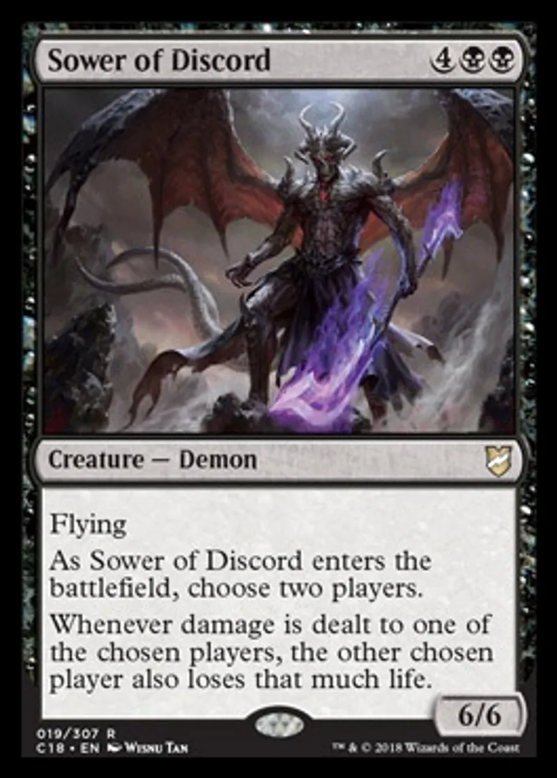 | Oracle Text | Flying As Sower of Discord enters the battlefield, choose two players. Whenever damage is dealt to one of the chosen players, the other chosen player also loses that much life. | ||