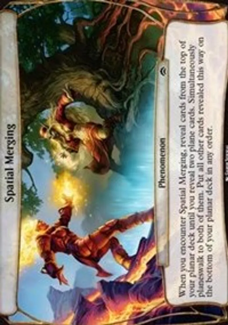 | Oracle Text | When you encounter Spatial Merging, reveal cards from the top of your planar deck until you reveal two plane cards. Simultaneously planeswalk to both of them. Put all other cards revealed this way on the bottom of your planar deck in any order. | ||