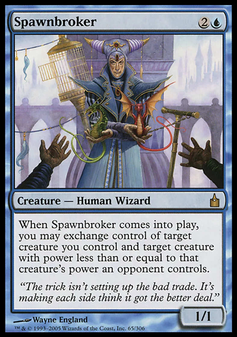 | Oracle Text | When Spawnbroker enters the battlefield, you may exchange control of target creature you control and target creature with power less than or equal to that creature's power an opponent controls. | ||