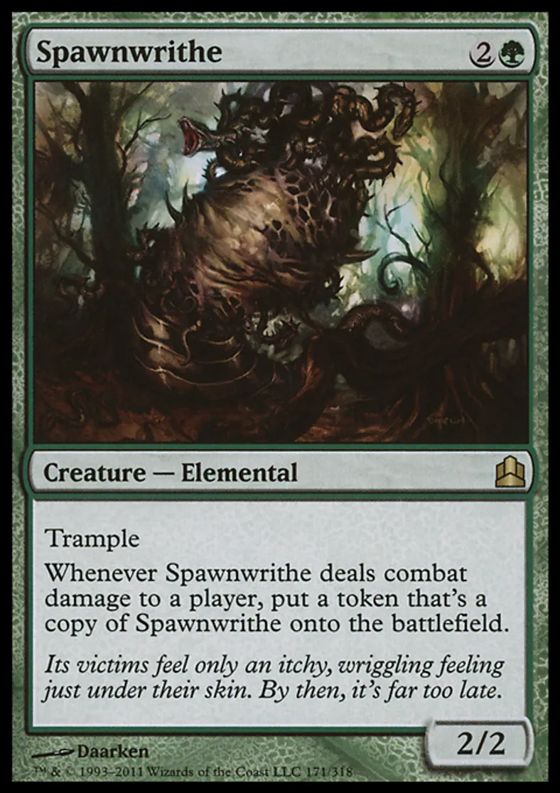| Oracle Text | Trample Whenever Spawnwrithe deals combat damage to a player, put a token that's a copy of Spawnwrithe onto the battlefield. | ||