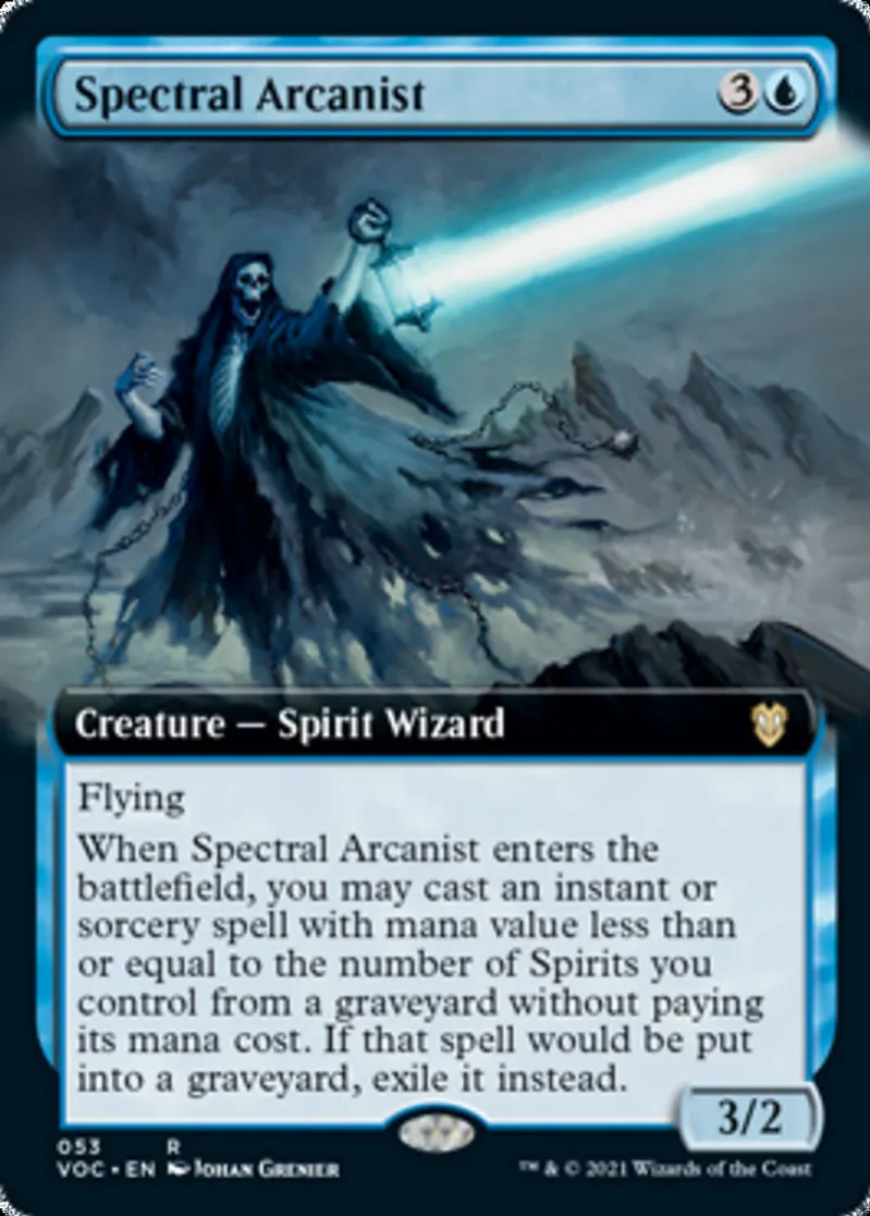 When Spectral Arcanist enters the battlefield, you may cast an instant or sorcery spell with mana value less than or equal to the number of Spirits you control from a graveyard without paying its mana cost. If that spell would be put into a graveyard, exile it instead. | ||