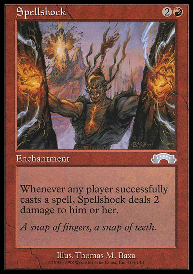 | Oracle Text | Whenever a player casts a spell, Spellshock deals 2 damage to that player. | ||