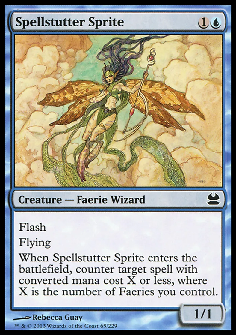 | Oracle Text | Flash Flying When Spellstutter Sprite enters the battlefield, counter target spell with converted mana cost X or less, where X is the number of Faeries you control. | ||