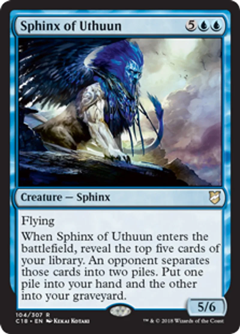 | Oracle Text | Flying When Sphinx of Uthuun enters the battlefield, reveal the top five cards of your library. An opponent separates those cards into two piles. Put one pile into your hand and the other into your graveyard. | ||