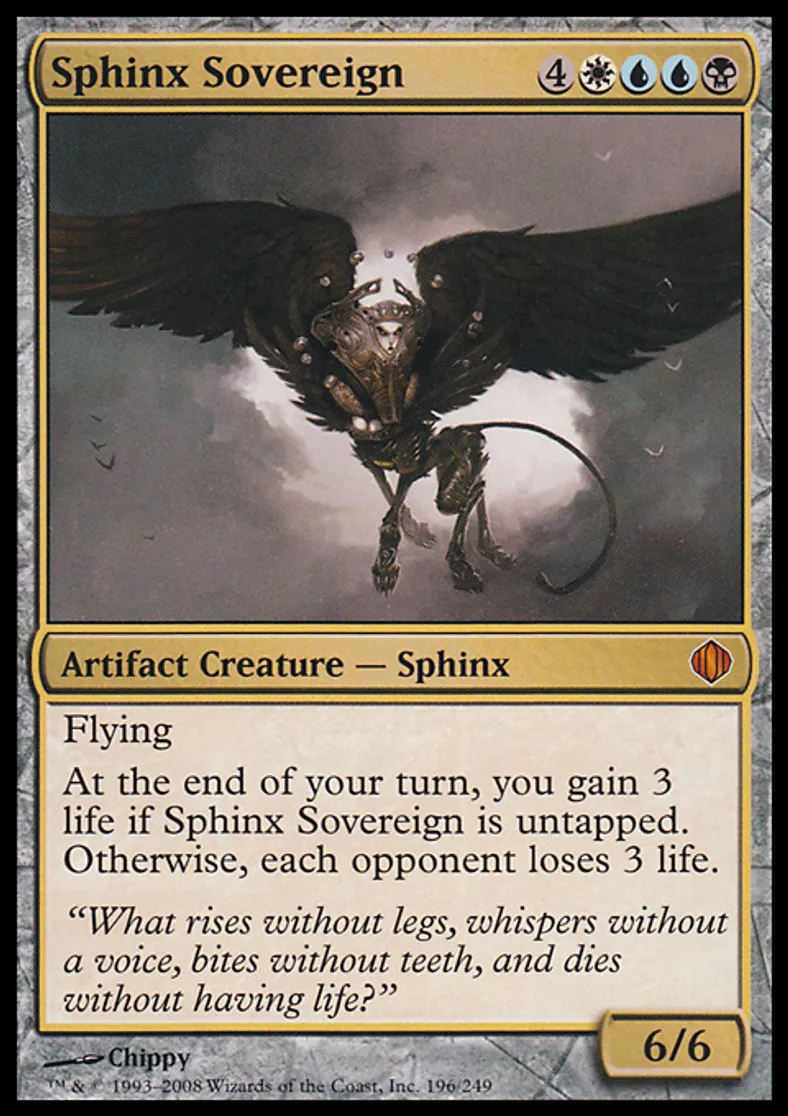 | Oracle Text | Flying At the beginning of your end step, you gain 3 life if Sphinx Sovereign is untapped. Otherwise, each opponent loses 3 life. | ||