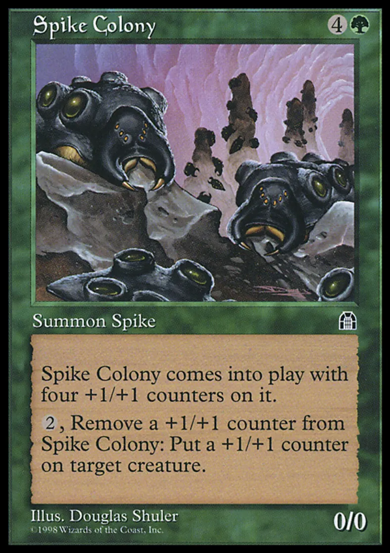 | Oracle Text | Spike Colony enters the battlefield with four +1/+1 counters on it. {{2}}, Remove a +1/+1 counter from Spike Colony: Put a +1/+1 counter on target creature. | ||