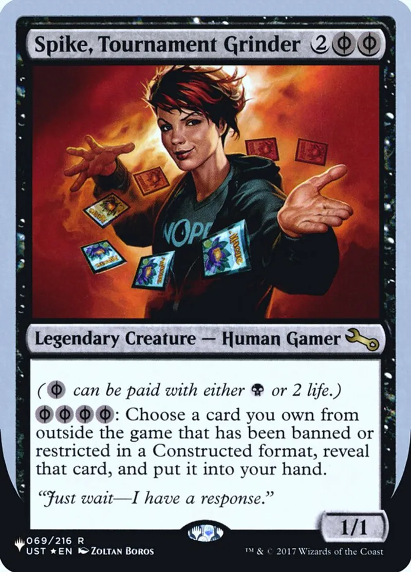 Magic: the Gathering (mtg) rare Legendary Creature — Human Gamer Spike, Tournament Grinder from The List (Unfinity Foil Edition) (uplist) last updated 2026-02-21 16:13:32