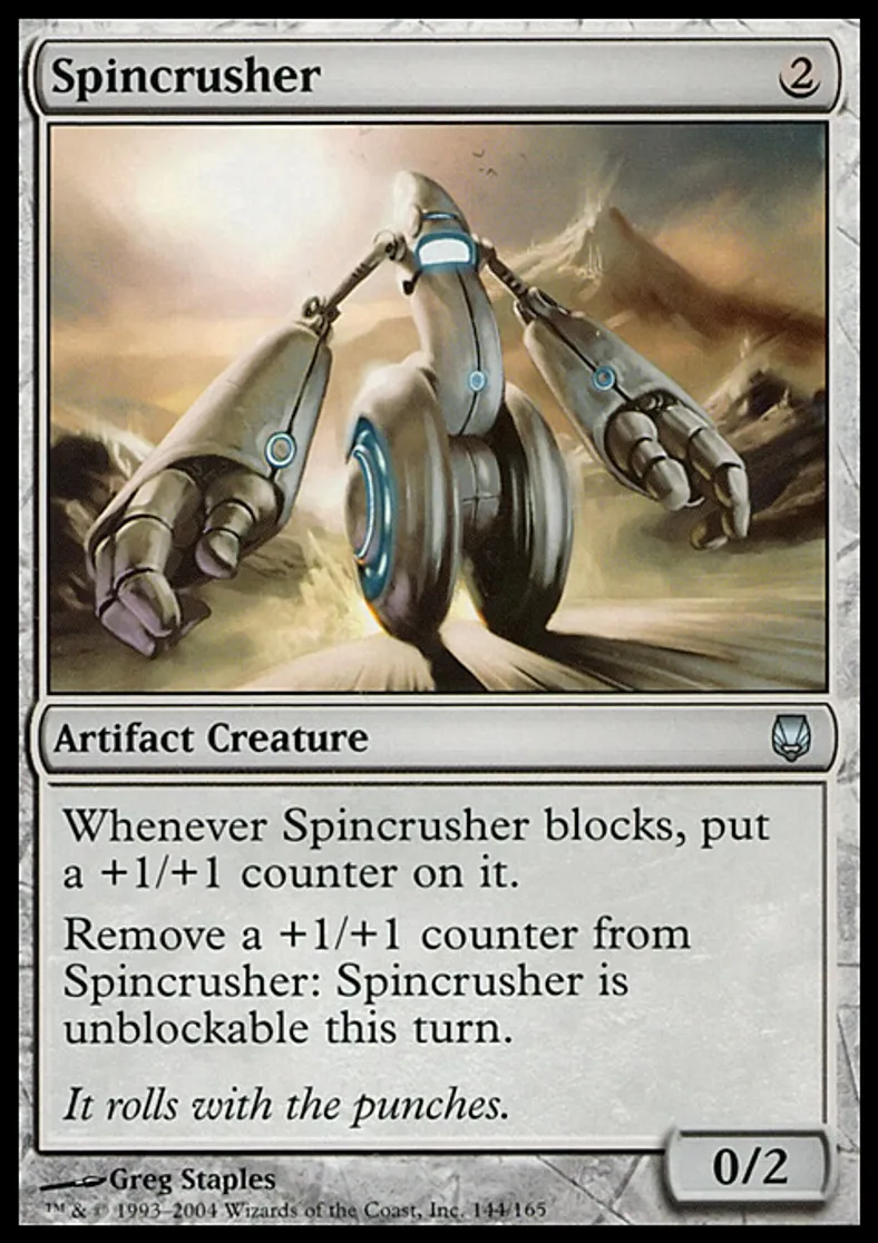 | Oracle Text | Whenever Spincrusher blocks, put a +1/+1 counter on it. Remove a +1/+1 counter from Spincrusher: Spincrusher is unblockable this turn. | ||