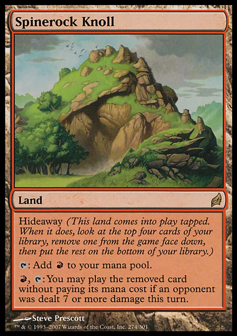 | Oracle Text | Hideaway (This land enters the battlefield tapped. When it does, look at the top four cards of your library, exile one face down, then put the rest on the bottom of your library.) {{t}}: Add {{r}} to your mana pool. {{r}}, {{t}}: You may play the exiled card without paying its mana cost if an opponent was dealt 7 or more damage this turn. | ||