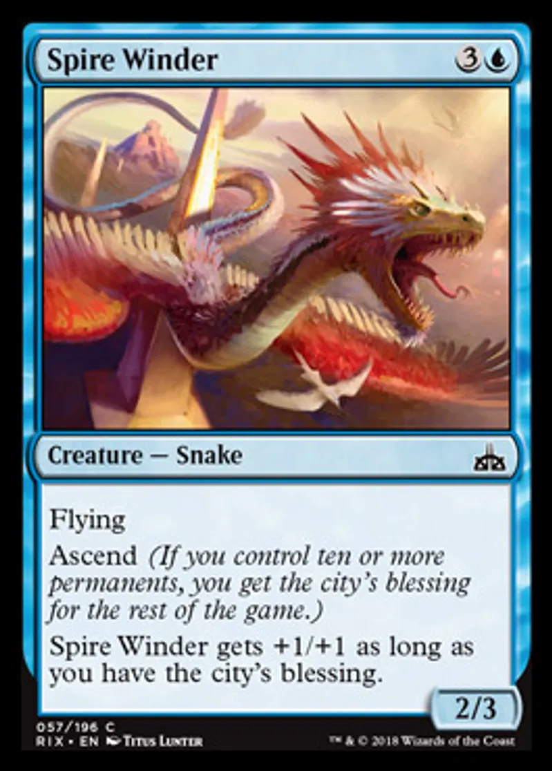 | Oracle Text | Flying Ascend (If you control ten or more permanents, you get the city's blessing for the rest of the game.) Spire Winder gets +1/+1 as long as you have the city's blessing. | ||