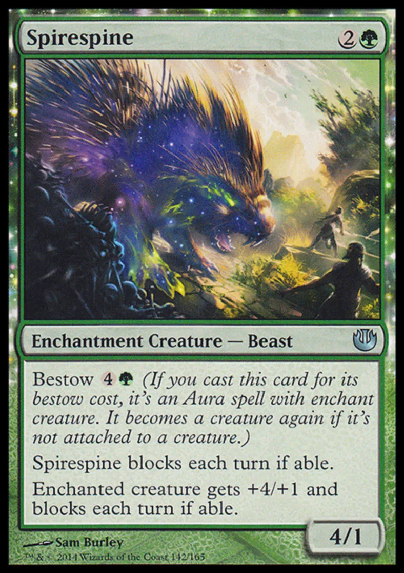 | Oracle Text | Bestow {{4}}{{g}} (If you cast this card for its bestow cost, it's an Aura spell with enchant creature. It becomes a creature again if it's not attached to a creature.) Spirespine blocks each turn if able. Enchanted creature gets +4/+1 and blocks each turn if able. | ||
