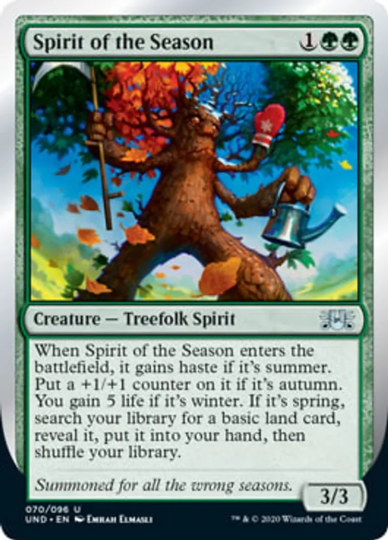 | Oracle Text | When Spirit of the Season enters the battlefield, it gains haste if it's summer. Put a +1/+1 counter on it if it's autumn. You gain 5 life if it's winter. If it's spring, search your library for a basic land card, reveal it, put it into your hand, then shuffle your library. | ||