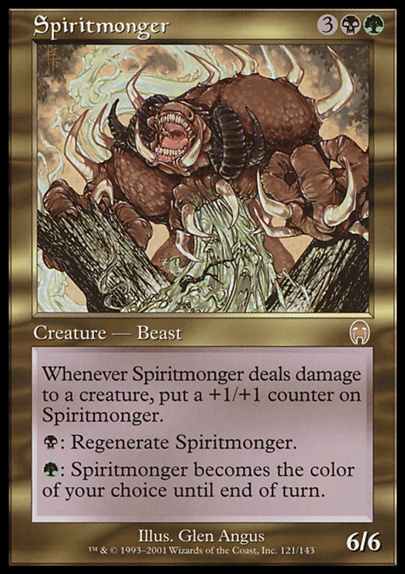 | Oracle Text | Whenever Spiritmonger deals damage to a creature, put a +1/+1 counter on Spiritmonger. {{b}}: Regenerate Spiritmonger. {{g}}: Spiritmonger becomes the color of your choice until end of turn. | ||