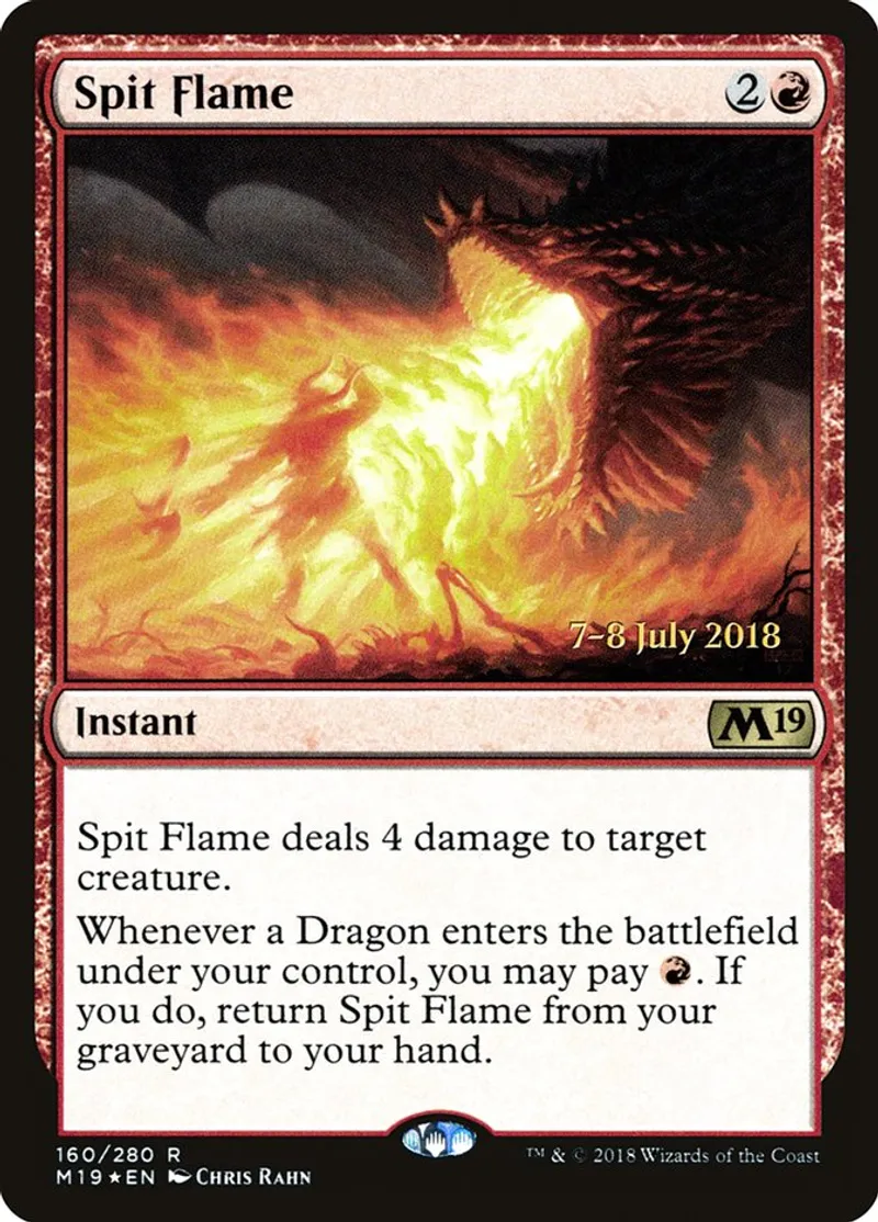 | Oracle Text | Spit Flame deals 4 damage to target creature.\r\n\r\nWhenever a Dragon enters the battlefield under your control, you may pay {{R}}. If you do, return Spit Flame from your graveyard to your hand. | ||