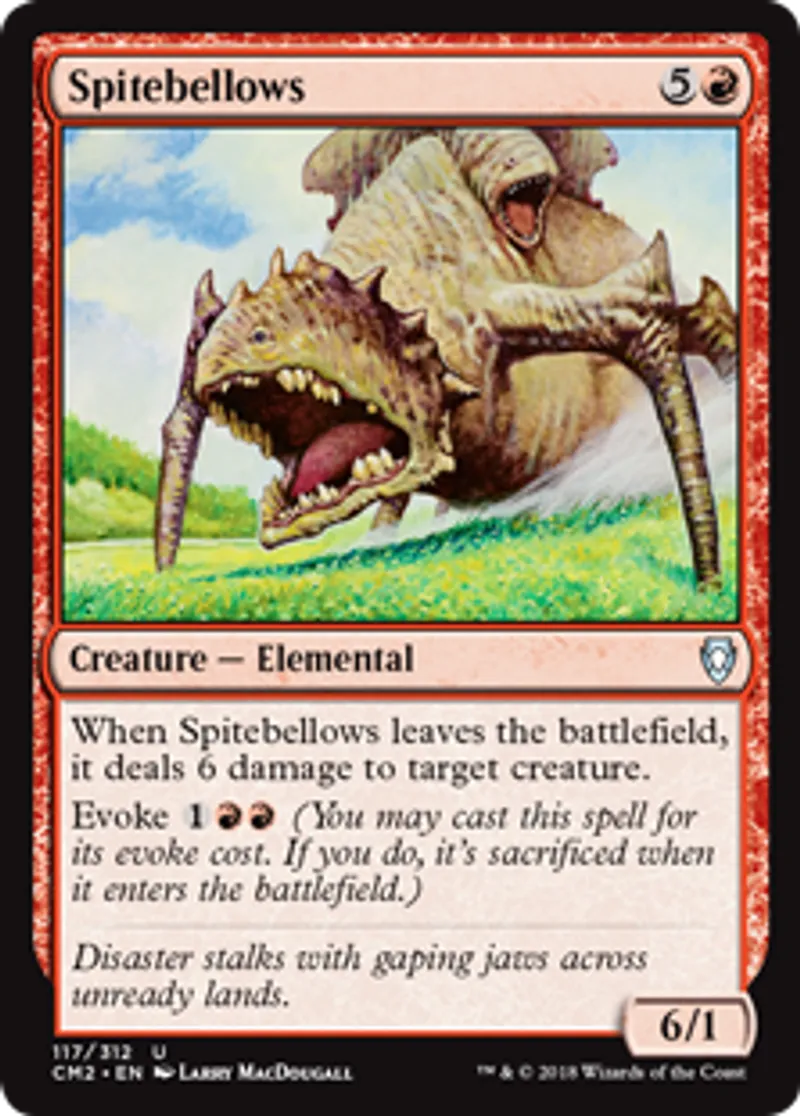 | Oracle Text | When Spitebellows leaves the battlefield, it deals 6 damage to target creature. Evoke {{1}}{{r}}{{r}} (You may cast this spell for its evoke cost. If you do, it's sacrificed when it enters the battlefield.) | ||