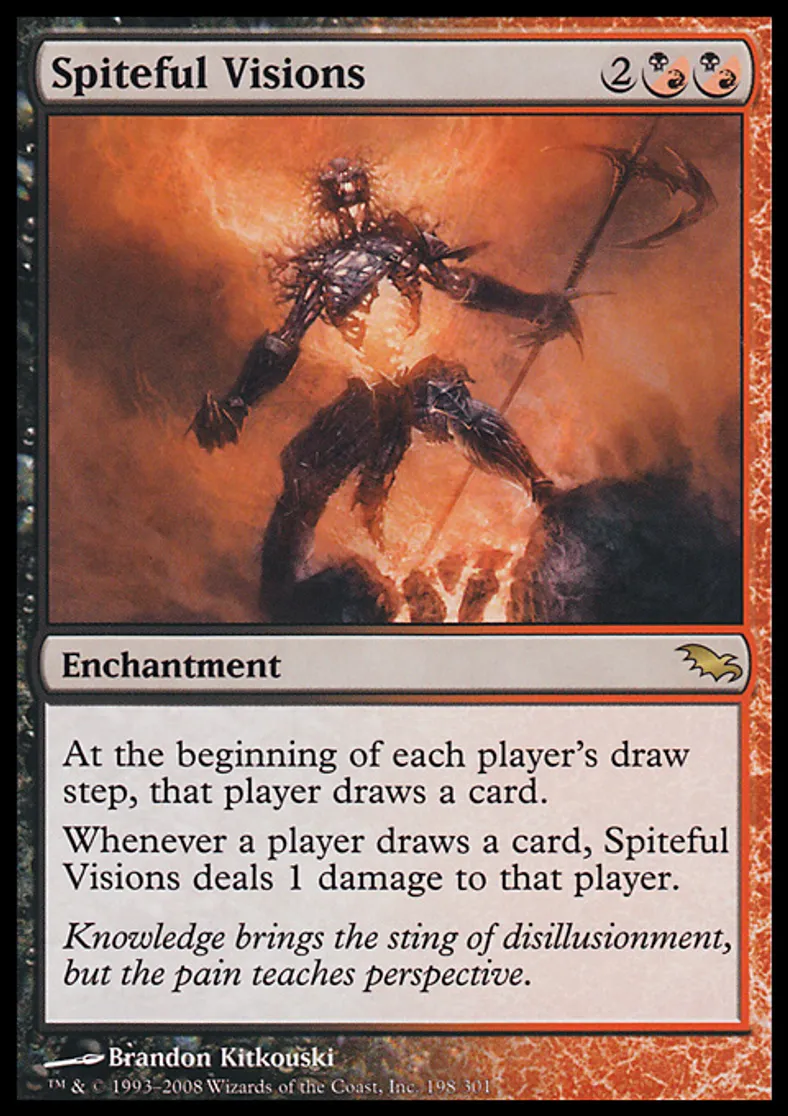 | Oracle Text | At the beginning of each player's draw step, that player draws an additional card. Whenever a player draws a card, Spiteful Visions deals 1 damage to that player. | ||