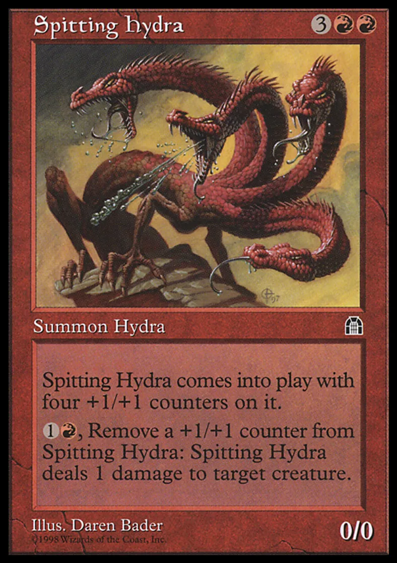 | Oracle Text | Spitting Hydra enters the battlefield with four +1/+1 counters on it. {{1}}{{r}}, Remove a +1/+1 counter from Spitting Hydra: Spitting Hydra deals 1 damage to target creature. | ||