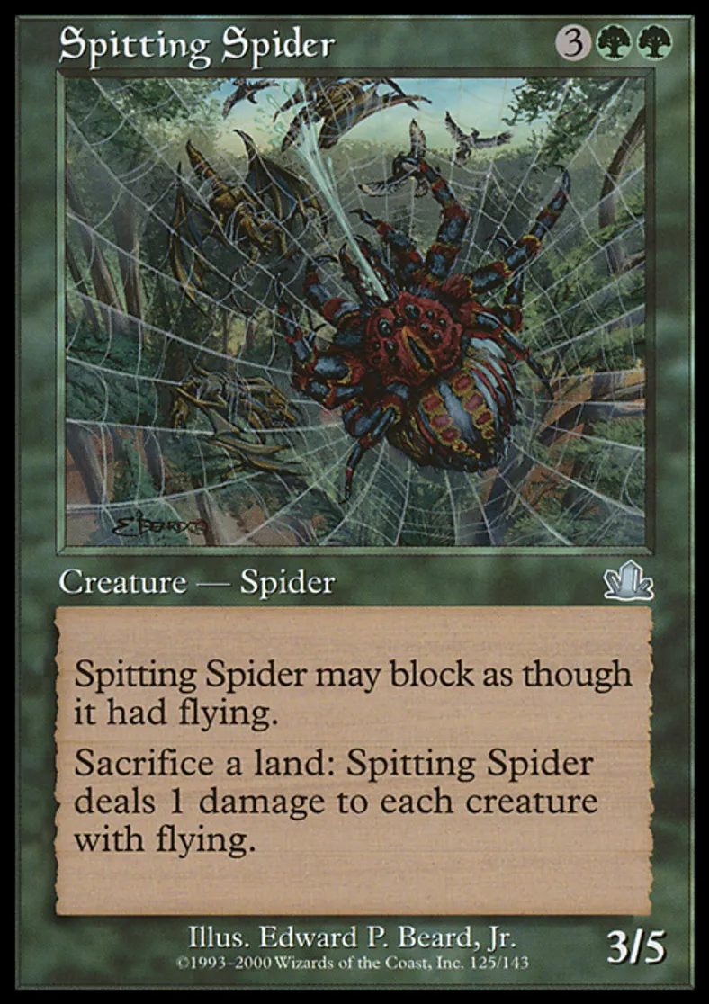 | Oracle Text | Reach (This creature can block creatures with flying.) Sacrifice a land: Spitting Spider deals 1 damage to each creature with flying. | ||