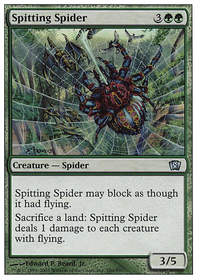 | Oracle Text | Reach (This creature can block creatures with flying.) Sacrifice a land: Spitting Spider deals 1 damage to each creature with flying. | ||