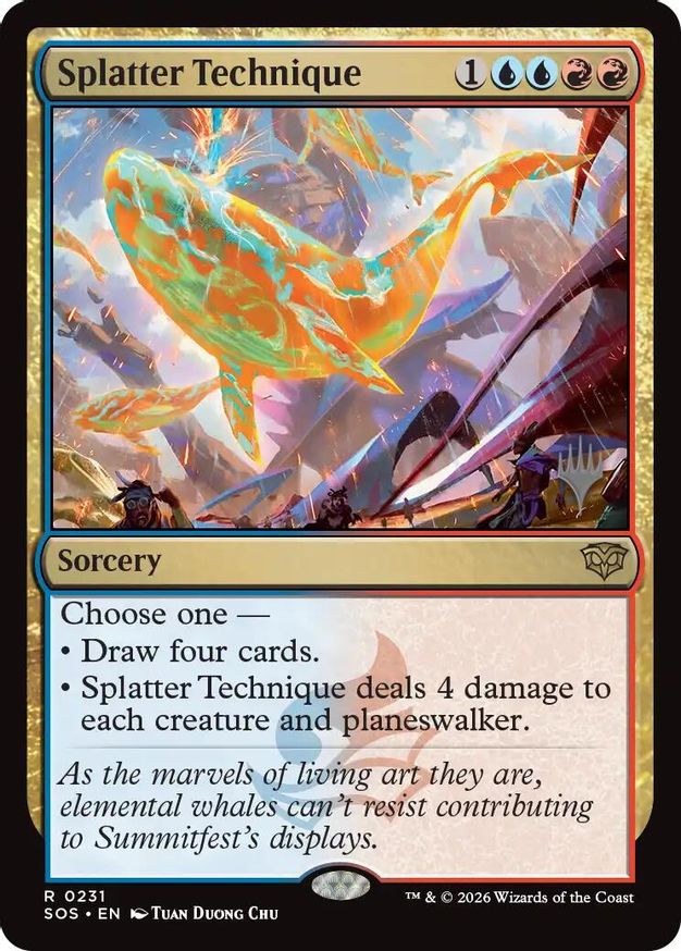 • draw four cards. • splatter technique deals 4 damage to each creature and planeswalker. | ||