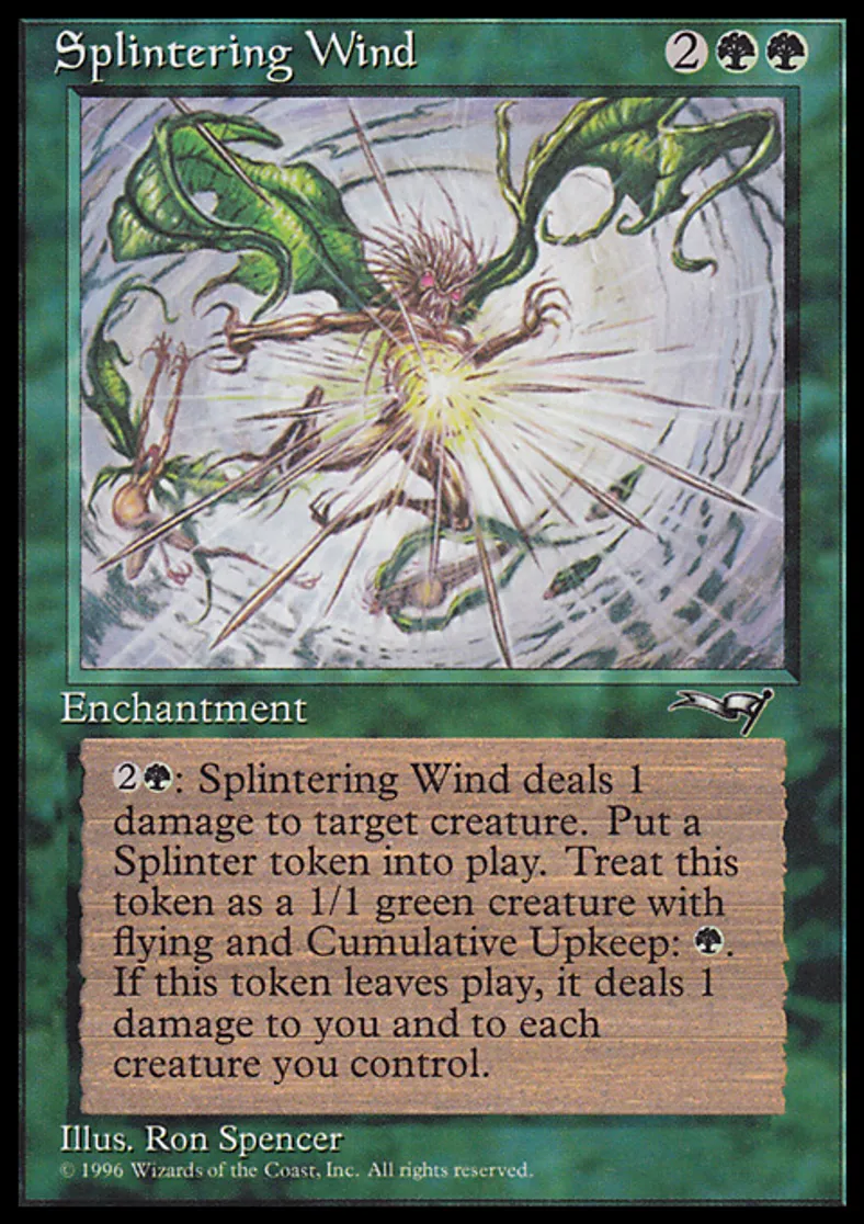 | Oracle Text | {{2}}{{g}}: Splintering Wind deals 1 damage to target creature. Put a 1/1 green Splinter creature token onto the battlefield. It has flying and "Cumulative upkeep {{g}}." When it leaves the battlefield, it deals 1 damage to you and each creature you control. (At the beginning of its controller's upkeep, that player puts an age counter on it, then sacrifices it unless he or she pays its upkeep cost for each age counter on it.) | ||