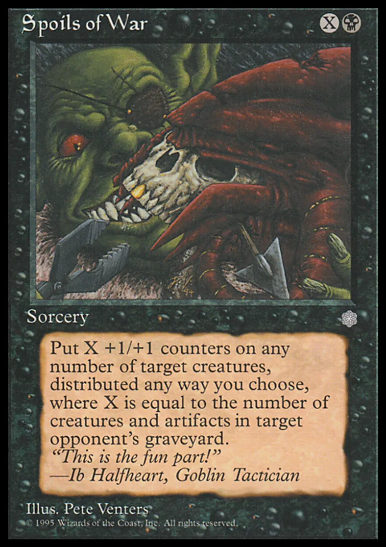| Oracle Text | X is the number of artifact and/or creature cards in an opponent's graveyard as you cast Spoils of War. Distribute X +1/+1 counters among any number of target creatures. | ||