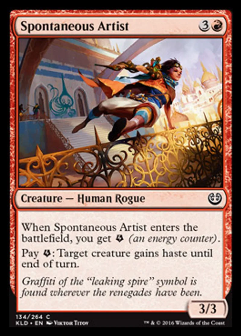 | Oracle Text | When Spontaneous Artist enters the battlefield, you get {{Energy}} (an energy counter). Pay {{Energy}}: Target creature gains haste until end of turn. | ||