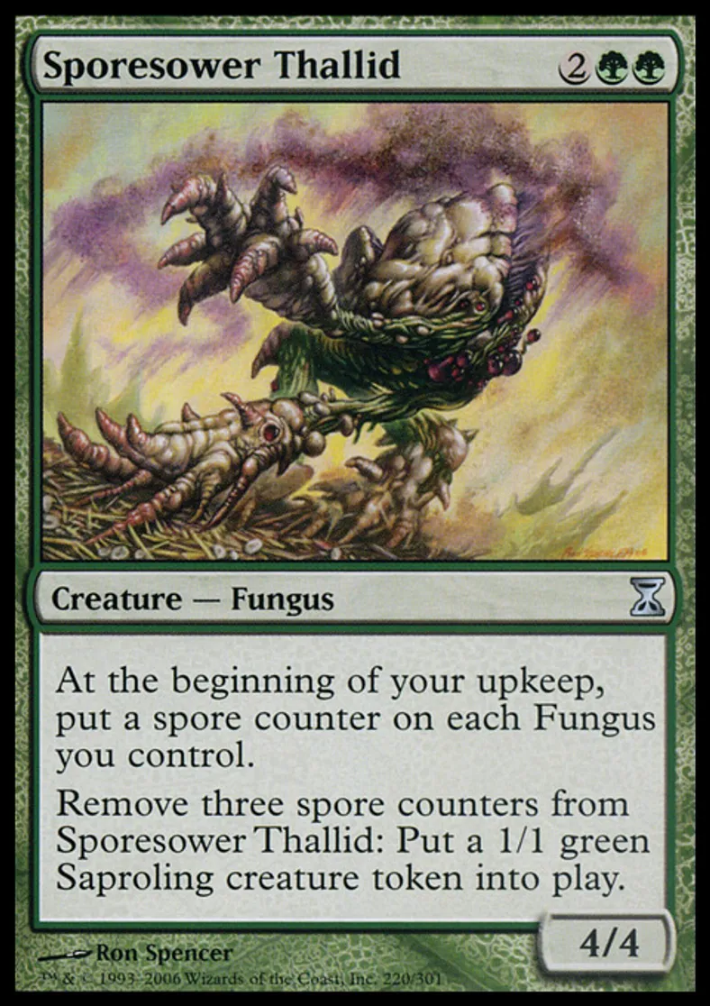 | Oracle Text | At the beginning of your upkeep, put a spore counter on each Fungus you control. Remove three spore counters from Sporesower Thallid: Put a 1/1 green Saproling creature token onto the battlefield. | ||