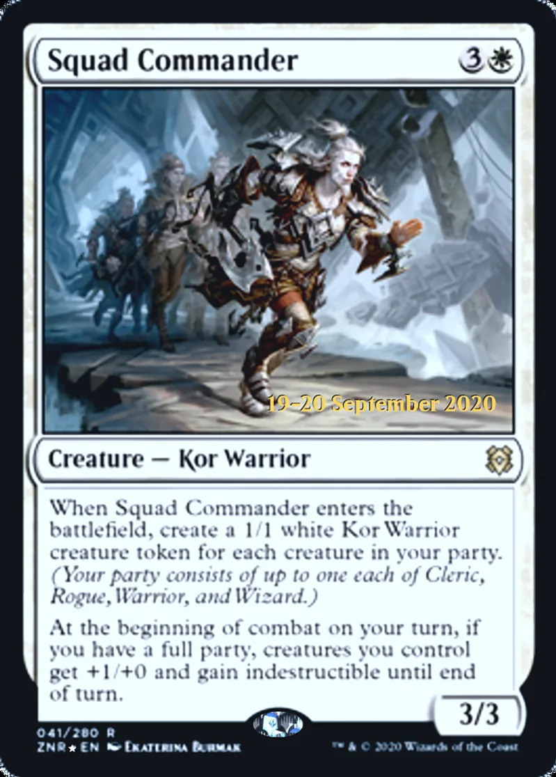 | Oracle Text | When Squad Commander enters the battlefield, create a 1/1 white Kor Warrior creature token for each creature in your party. (Your party consists of up to one each of Cleric, Rogue, Warrior, and Wizard.)