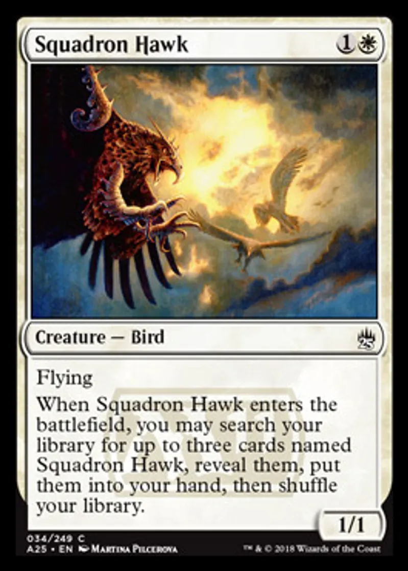 | Oracle Text | Flying When Squadron Hawk enters the battlefield, you may search your library for up to three cards named Squadron Hawk, reveal them, put them into your hand, then shuffle your library. | ||
