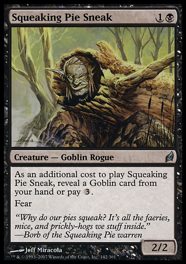 | Oracle Text | As an additional cost to cast Squeaking Pie Sneak, reveal a Goblin card from your hand or pay {{3}}. Fear (This creature can't be blocked except by artifact creatures and/or black creatures.) | ||