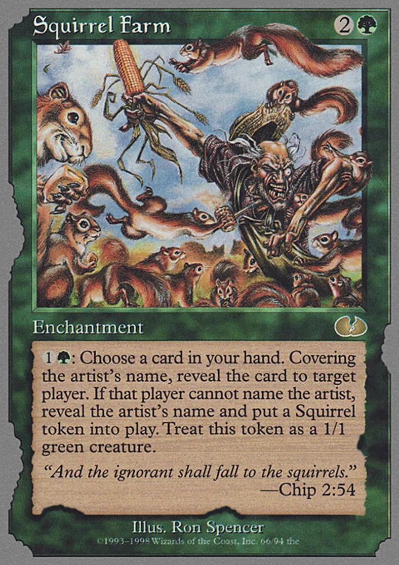 | Oracle Text | o1oG: Choose a card in your hand. Covering the artist's name, reveal the card to target player. If that player cannot name the artist, reveal the artist's name and put a Squirrel token into play. Treat this token as a 1/1 green creature. | ||