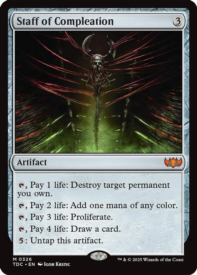 Magic: the Gathering (mtg) Mythic Rare artifact Staff of Compleation from Commander: Tarkir: Dragonstorm (TDC) last updated 2026-02-25 14:22:32