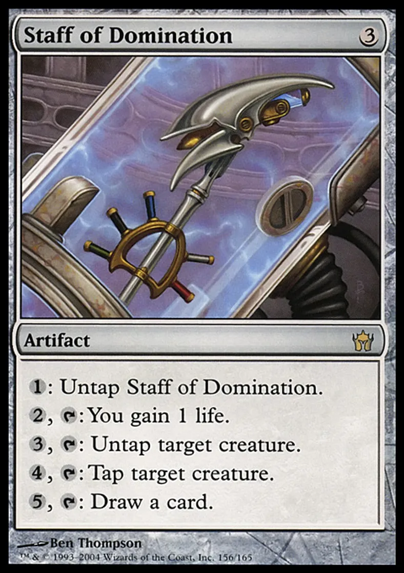 | Oracle Text | {{1}}: Untap Staff of Domination. {{2}}, {{t}}: You gain 1 life. {{3}}, {{t}}: Untap target creature. {{4}}, {{t}}: Tap target creature. {{5}}, {{t}}: Draw a card. | ||