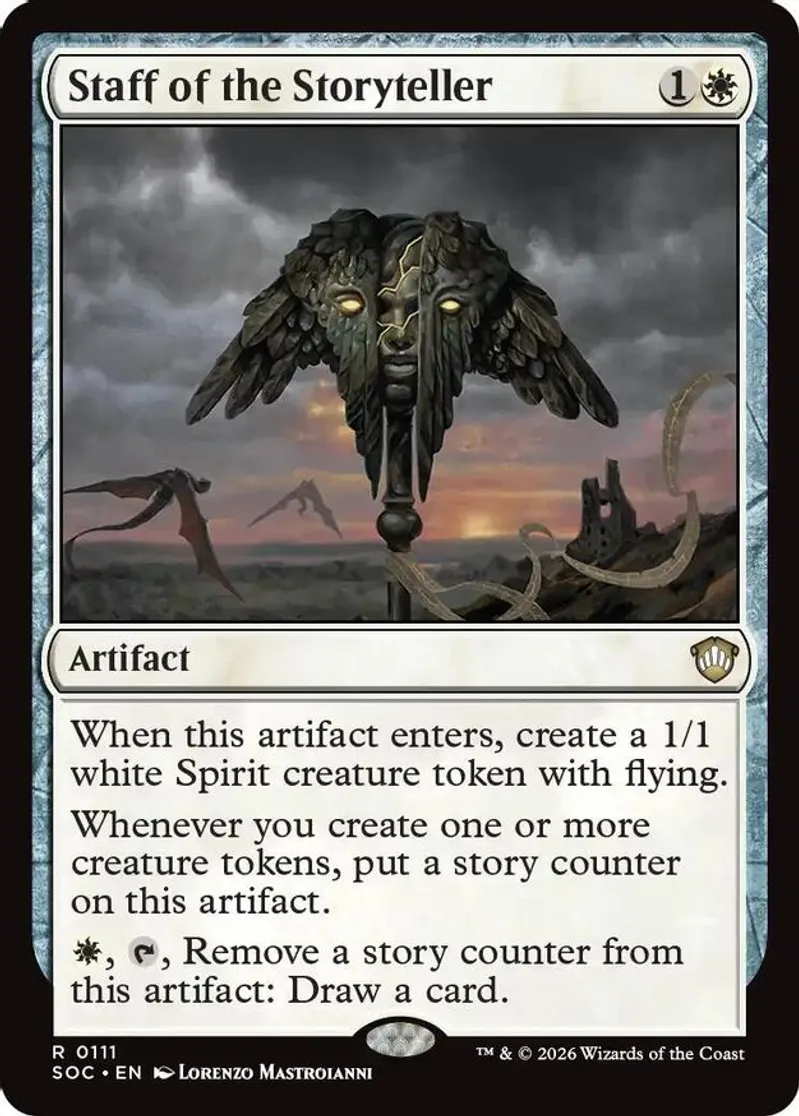 Magic: the Gathering (mtg) Rare artifact Staff of the Storyteller from Commander: Secrets of Strixhaven (SOC) last updated 2026-04-17 00:15:42